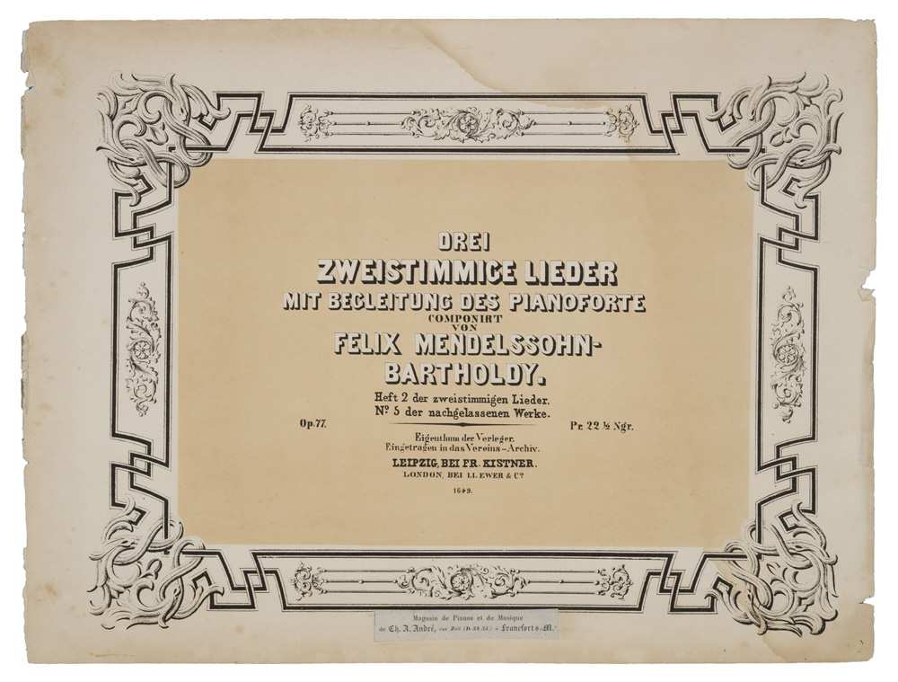 DREI / ZWEISTIMMIGE LIEDER / MIT BEGLEITUNG DES PIANOFORTE / COMPONIRT / VON / FELIX MENDELSSOHN- / BARTHOLDY. / Heft 2. der zweistimmigen Lieder. / N°. 5. der nachgelassenen Werke. / Op.77.