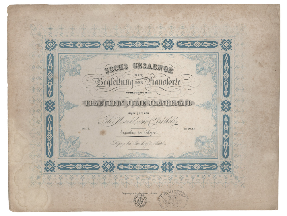 SECHS GESAENGE / MIT / Begleitung DES Pianoforte / componirt und / FRAEULEIN JULIE JEANREAUD / zugeeignet von / Felix Mendelssohn Bartholdy. /
