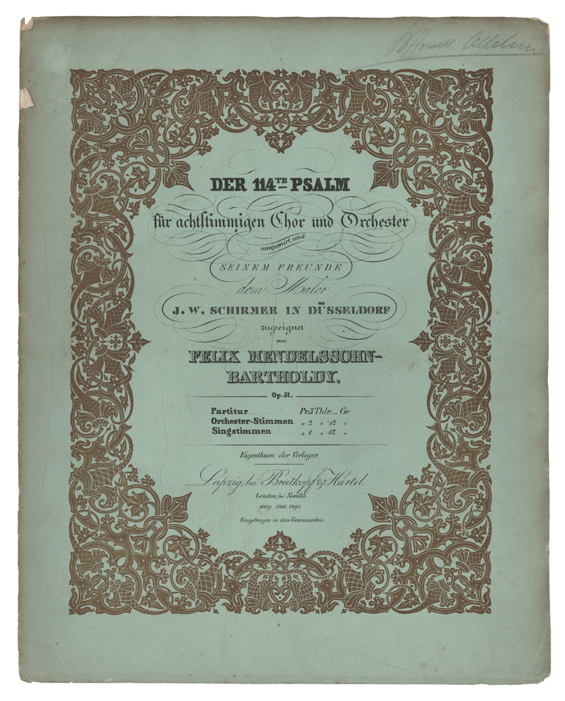 DER 114.TE PSALM / für achtstimmigen Chor und Orchester / componirt und / seinem Freunde / dem Maler / J. W. Schirmer in Düsseldorf / zugeeignet / von / FELIX MENDELSSOHN- / BARTHOLDY. / Op.51.