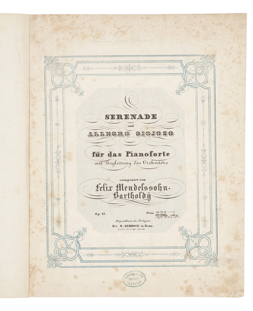 SERENADE / und / ALLEGRO GIOJOSO / für das Pianoforte / mit Begleitung des Orchesters / componirt von / Felix Mendelssohn- / Bartholdÿ / Op. 43.