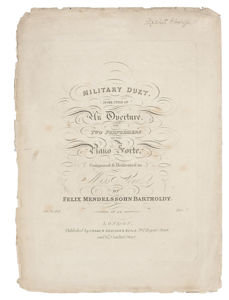 MILITARY DUET. / IN THE STYLE OF / An Ouverture / FOR / TWO PERFORMERS / ON THE / Piano Forte / Composed & Dedicated to / Miss Stone / BY / FELIX MENDELSSOHN BARTHOLDY. / OP. 24.