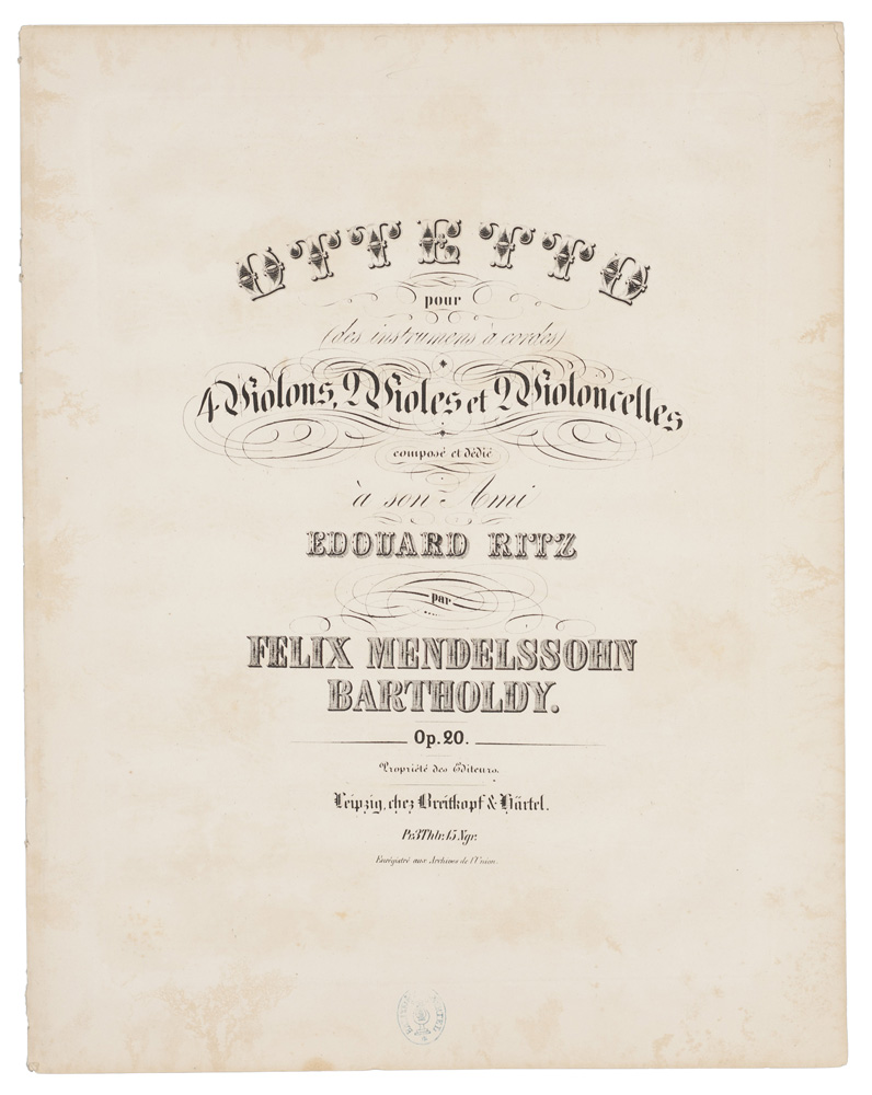 OTTETTO / pour / (des instrumens à cordes) / 4 Violons, Violes et Violoncelles / composé et dédié / à son Ami / EDOUARD RITZ / par / FELIX MENDELSSOHN / BARTHOLDY / Op. 20.